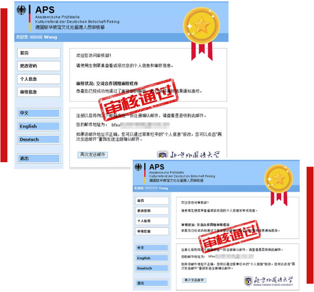 点击查看全文今日下午,北京外国语大学出国留学培训基地德国预科中心收到了同学们的好消息,参加2019年10月26日德适考试的同学收到APS审核部发来的邮件,结果都是——通过审核!!!